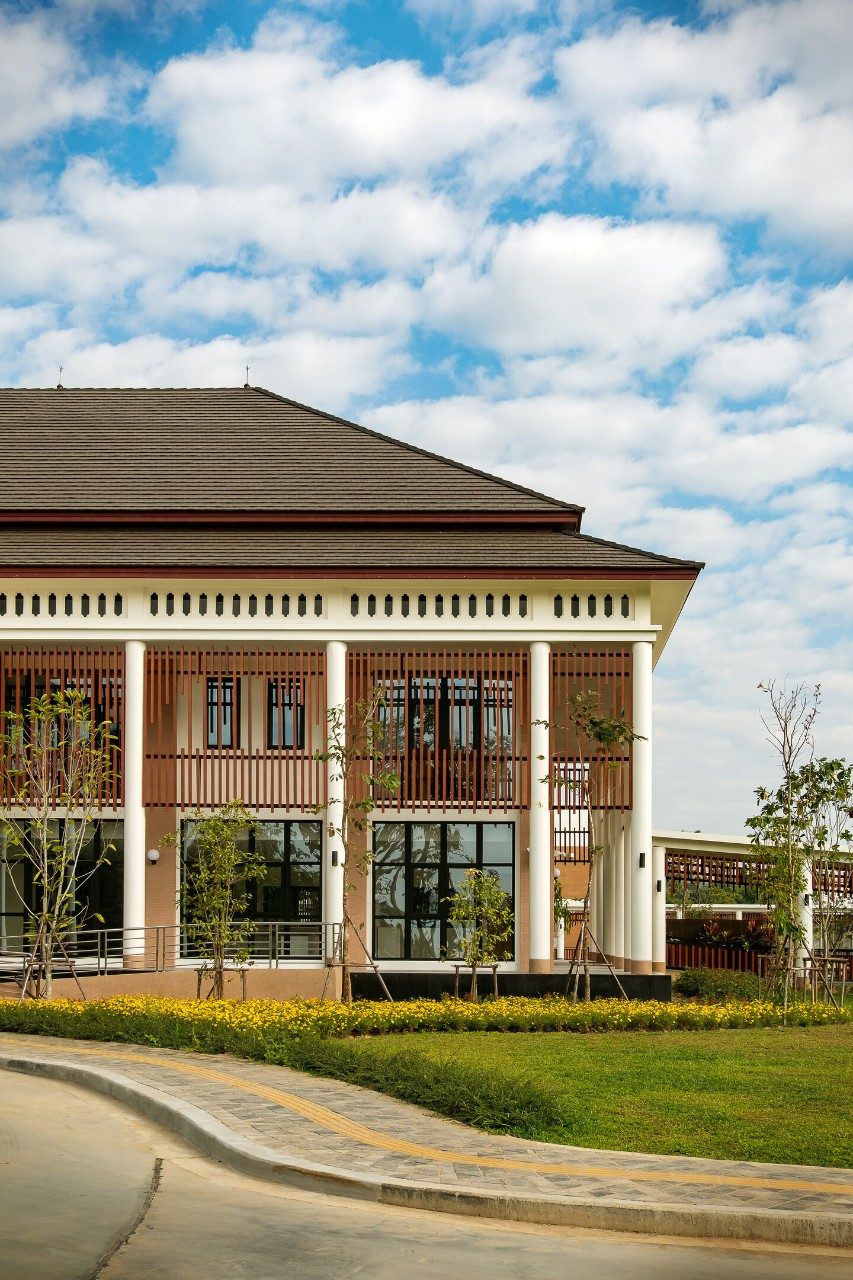 Assistant Professor Dr. Rattaphol Angkasit, a professor at the Faculty of Architecture, Chiang Mai University assigned to design and oversee the architecture of the Agricultural Research and Development Center, incorporates the Lanna style to the new context, showcasing discernible details and aesthetics of the vernacular architectural characteristics. The northern style Punya roof is designed into descending levels from the three buildings structures, bringing the Lanna flare to lessen the imposing scale of the buildings. The steepness enhances rainwater drainage while hiding the system work of the air conditioning installed at the upper part of each structure.