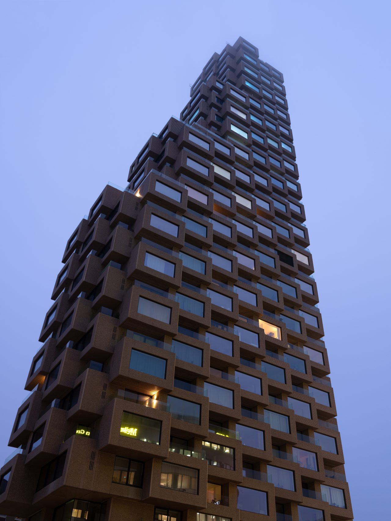 Designed by OMA, the 125-metre tall Innovationen Tower is the highest residential building in Stockholm and is the first of two Norra Tornen residential towers to be completed in Hagastaden, a new district in North Stockholm. The Tower comprises 182 residential units, as well as a cinema, dinner room for parties, guest apartment, gym, sauna and shops on the ground floor. The tower has an unusual architectural style, with alternating protruding windows, recessed terraces and a façade of ribbed concrete brushed with aggregate pebbles.