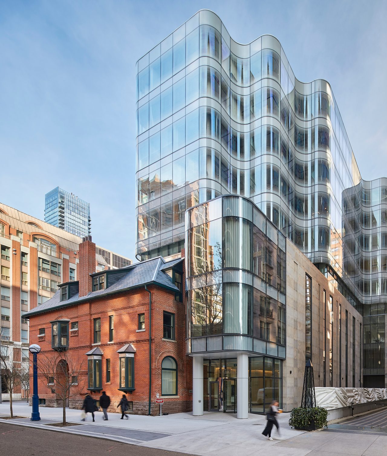 The solution: The sinuous, six-story tower incorporates low-iron bent glass with a white pattern to flow above the heritage buildings that make up its podium, providing a stunning accompaniment to the existing façades.