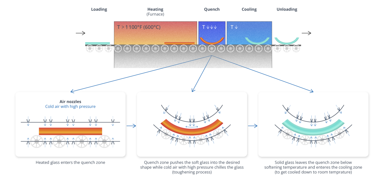 This prevents both roller wave distortion and anisotropy, and although tempered, or safety glass cannot be used, laminates can be added to provide safety features. However, it remains a time-consuming process, and coatings must withstand a longer heating period.
