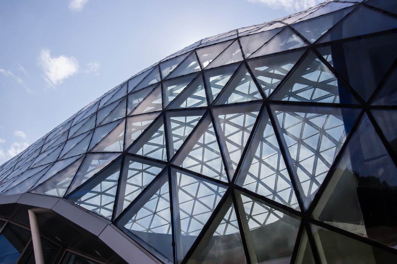 Tuto obrovskou prosklenou plochu tvoří potahované sklo Guardian SunGuard® Solar Light Blue 52. Vyznačuje se vynikající propustností světla, takže se zdá, že tato gigantická futuristická konstrukce je lehká až téměř nehmotná!