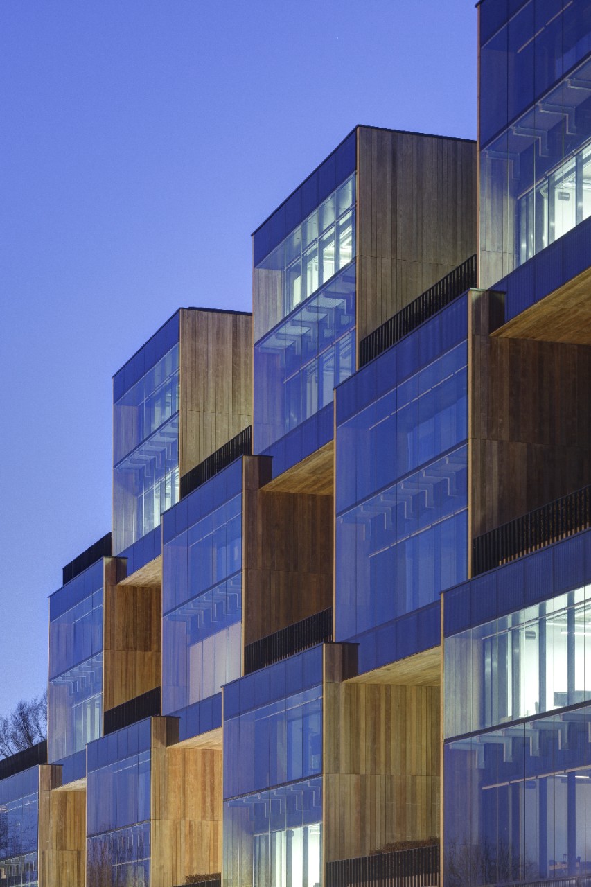 Das ungewöhnliche Glas außen des Gebäudes hat zwei deutlich unterschiedliche Seiten. Während die nach Norden ausgerichtete Seite des Gebäudes einfach, glatt und dezent ist, besteht der nach Süden ausgerichtete Teil aus räumlich angeordneten Würfeln, die eine Art Schachbrett bilden. Der Raum zwischen den Würfeln ist mit vielfältiger Vegetation und Holzelementen gefüllt, die in Kombination mit einem riesigen Dachgarten dem Gebäude ein wirklich ökologisches Gefühl verleihen.