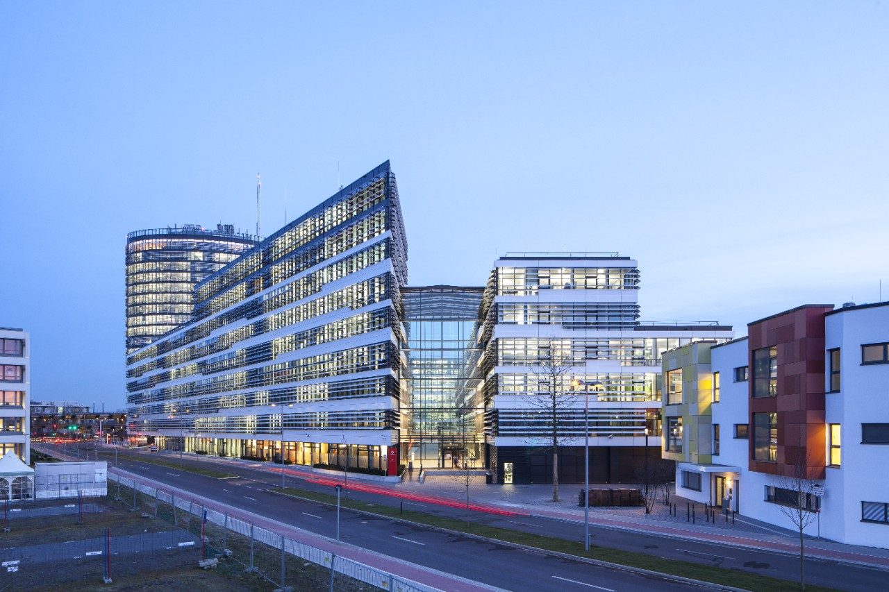 Der Vodafone Campus in Düsseldorf, Deutschland, ist ein "grünes Gebäude", das mit Guardian SunGuard® SuperNeutral™ 62/34 verkleidet ist. Das Projekt erhielt die LEED Platinum Zertifizierung.