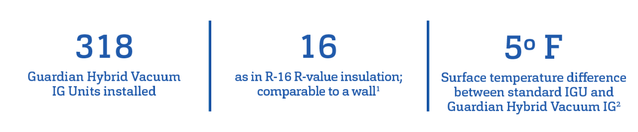 6 Guardian Vacuum IG and Hybrid Vacuum IG units are certified by the Insulating Glass Certification Council (IGCC) confirming the long-term durability of both products. (IGCC #4909, #4910). Guardian Hybrid Vacuum IG units for this project were produced in a Guardian Glass pilot facility.