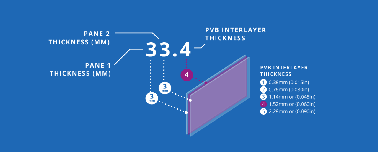 The nomenclature for laminated glass describes its build-up by considering the number and thickness of the glass panes used and the thickness of the interlayers.