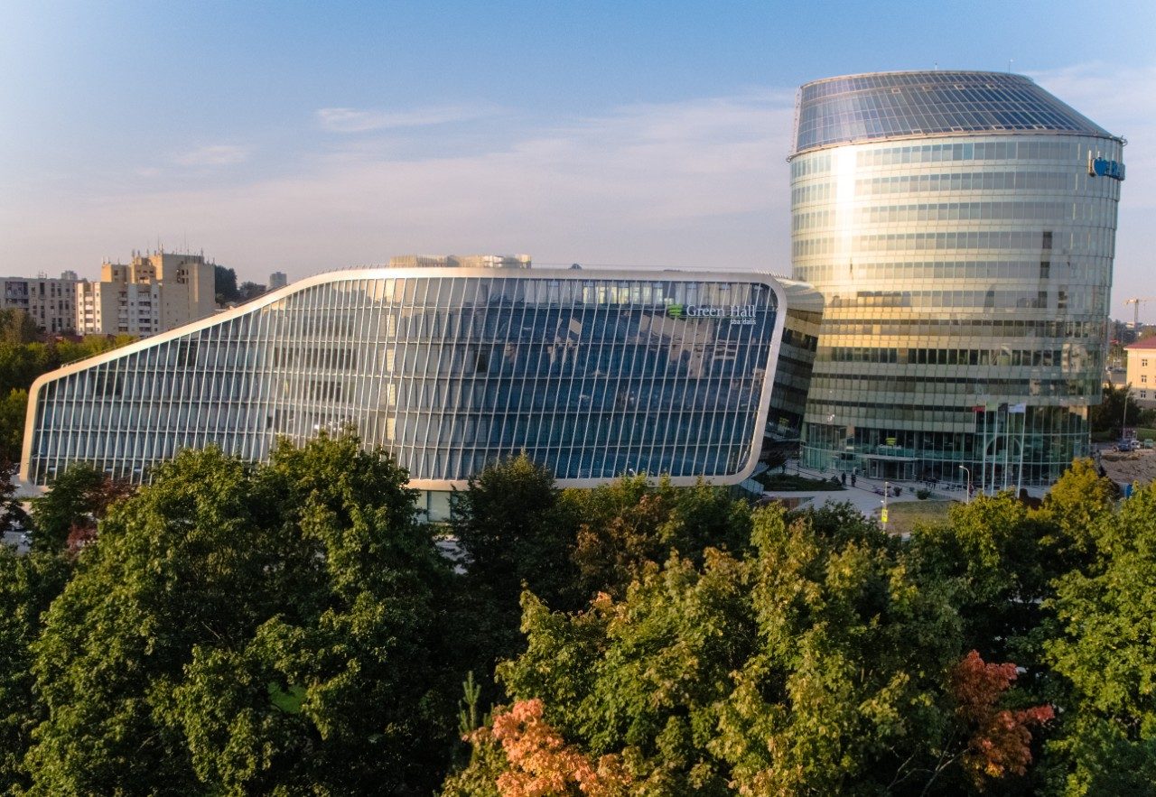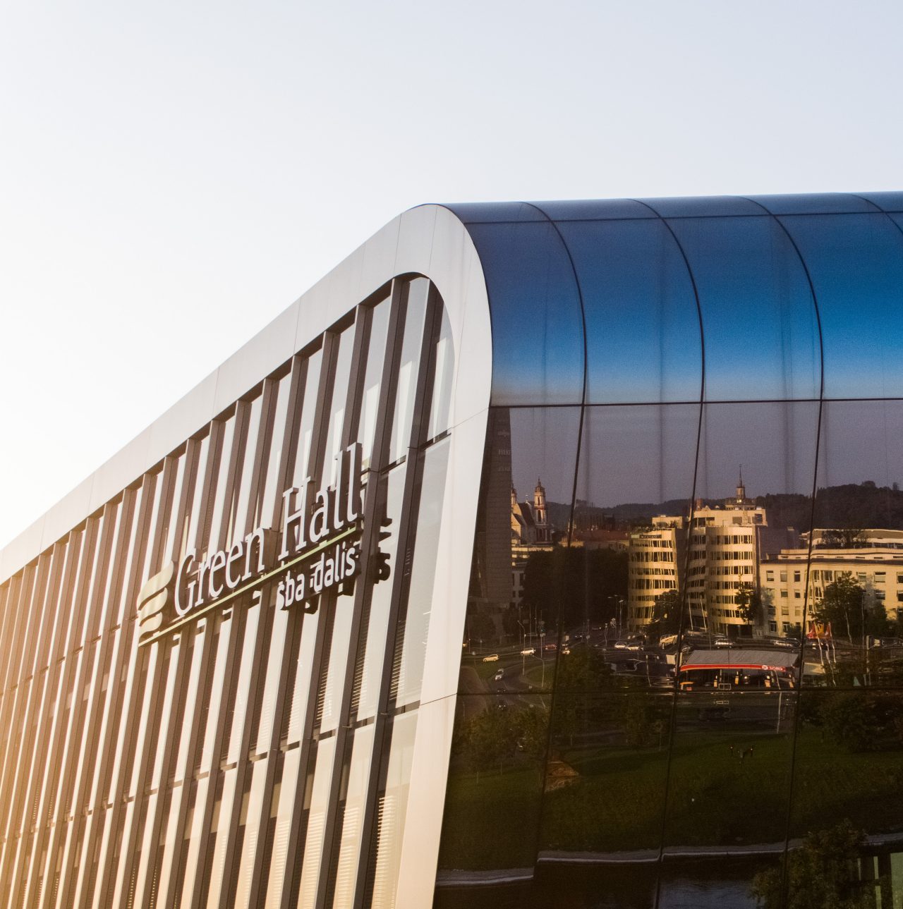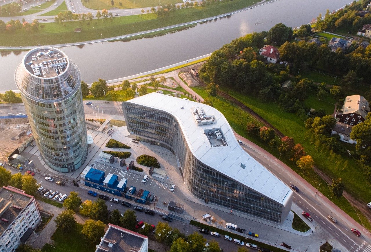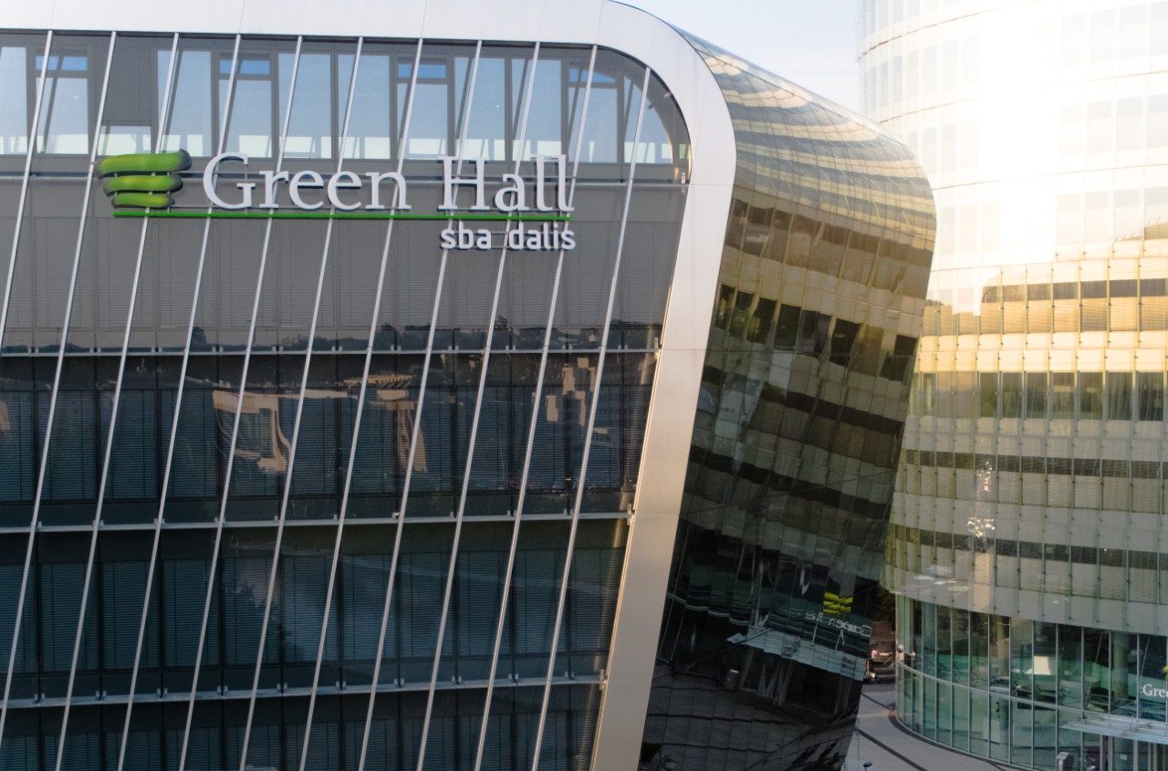 Designed by Arrow Architects and UAB Archinova, Green Hall 2 is a 8,566- square-metre office building that overlooks a beautiful green landscape set along the river in the heart of Vilnius. The building owner desired a new Class A building that was in harmony with nature.