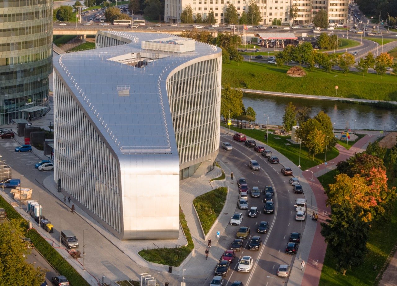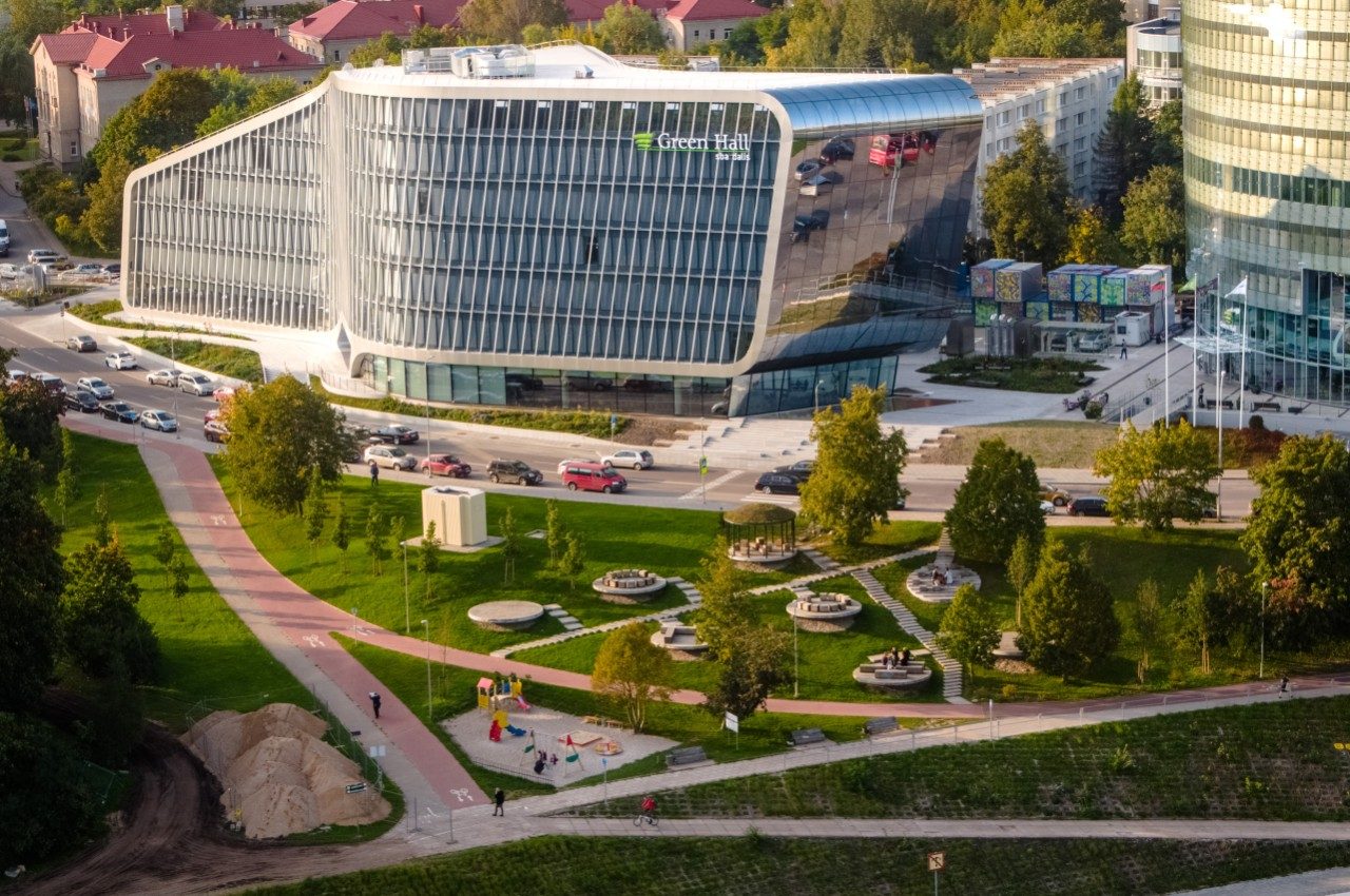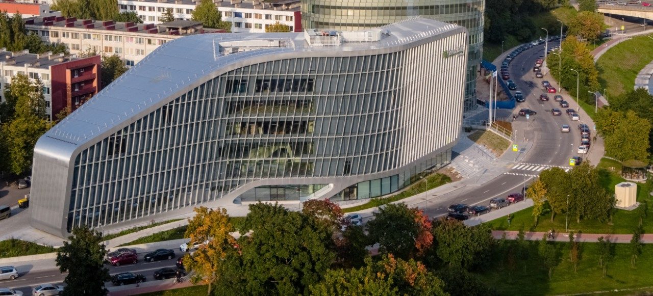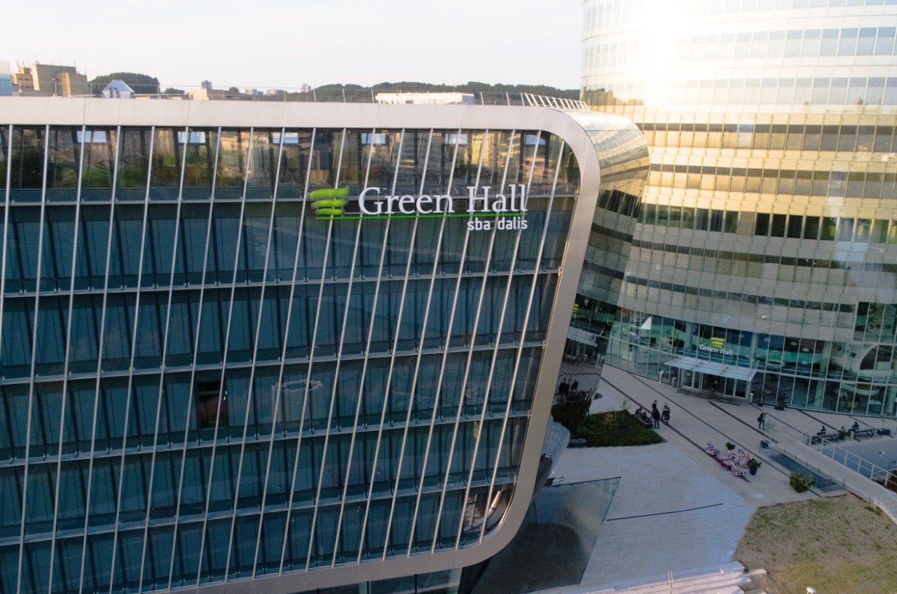 Designed by Arrow Architects and UAB Archinova, Green Hall 2 is a 8,566- square-metre office building that overlooks a beautiful green landscape set along the river in the heart of Vilnius. The building owner desired a new Class A building that was in harmony with nature.