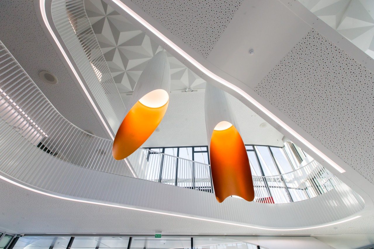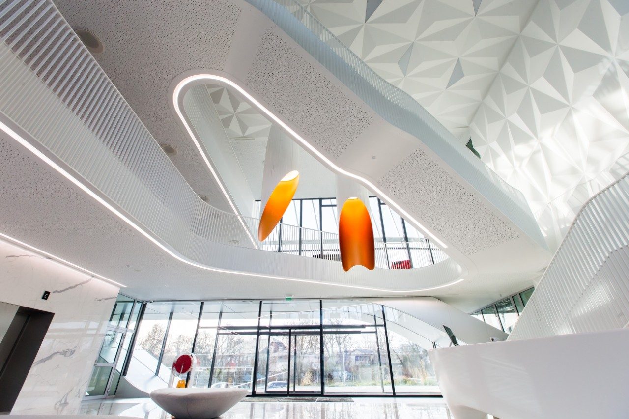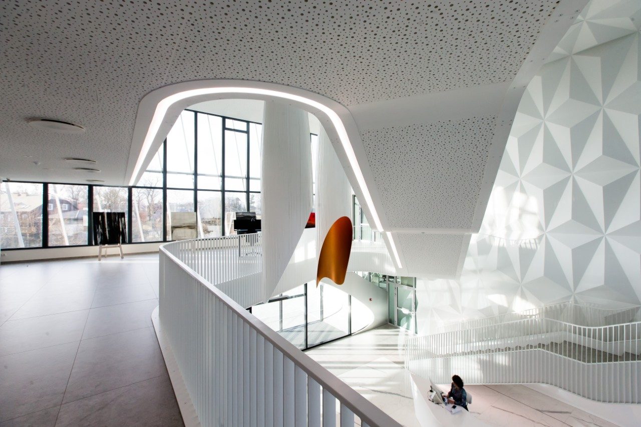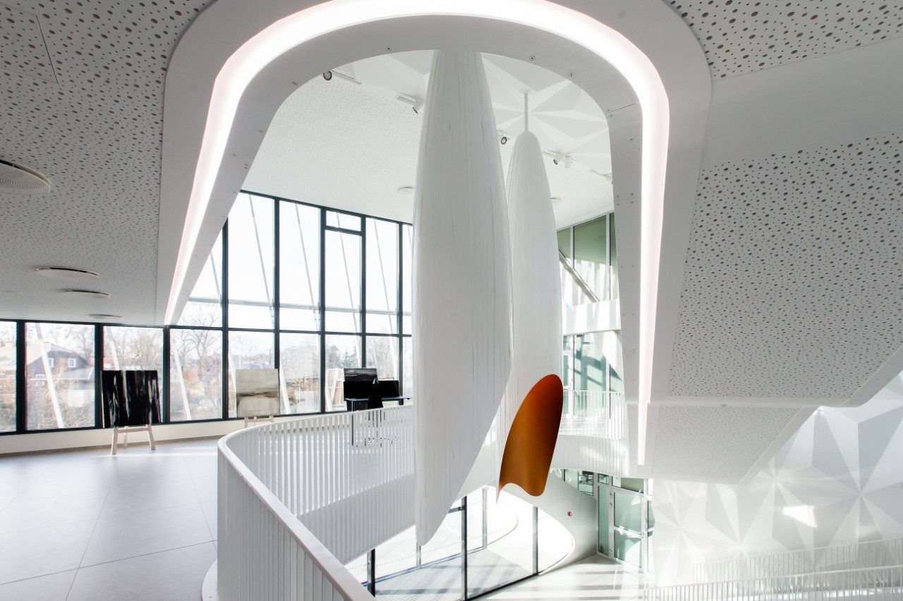 The expressive shape of the new building integrates harmoniously into its surroundings, giving the structure its overall dynamic character and freeing it from constraints imposed by the building site.
