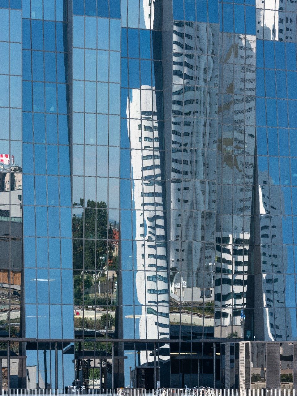 Debido al ingenioso acristalamiento estructural, la estética es visualmente atractiva y refleja el entorno del edificio en todos los lados.