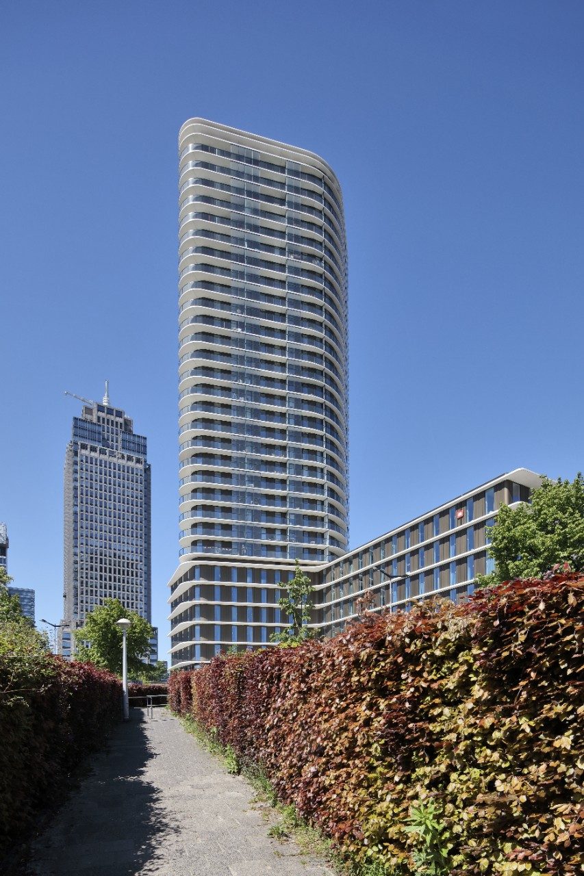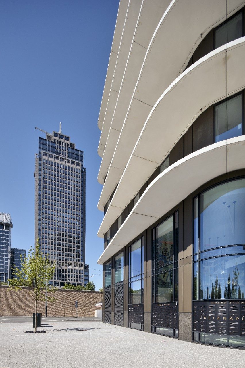 Het iconische silhouet van de toren is geïnspireerd op de ronde overkapping van het Amstelstation en versterkt de skyline van Amsterdam. De overkapping van de toren biedt buitenruimte, zonwering en geluidsbescherming voor de appartementen. Het ritme van de verticale elementen in de glazen gevel is zorgvuldig gesynchroniseerd met het ritme van de gevel van de grote stationshal.