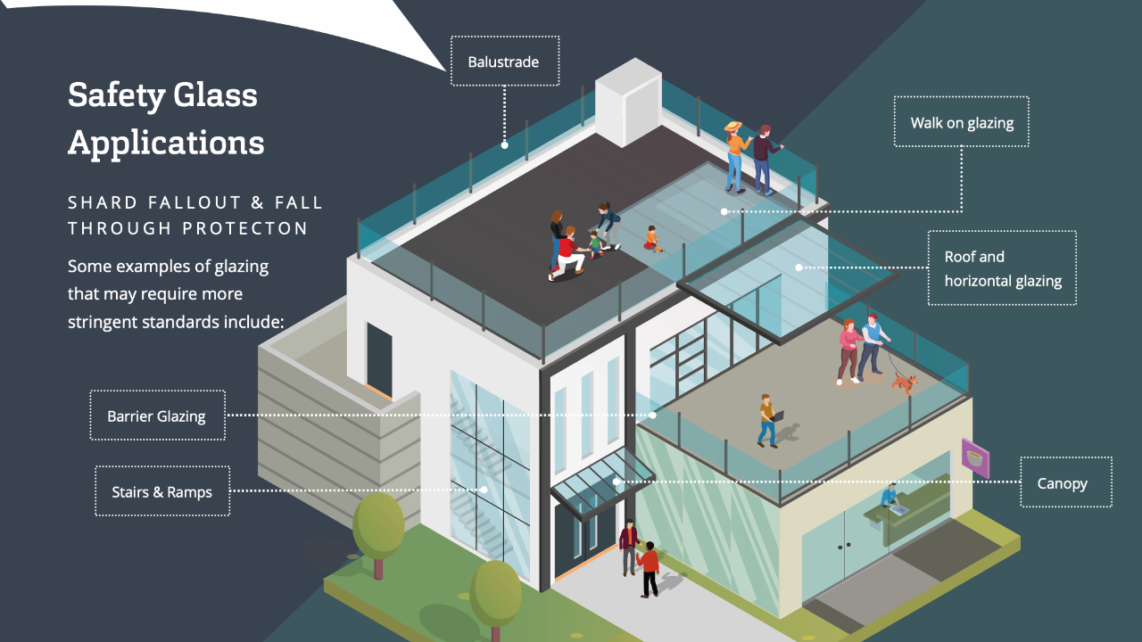 Sticla de siguranță este de obicei necesară în locații periculoase cu risc ridicat de accidente cauzate de impactul asupra oamenilor. Aplicațiile tipice sunt: