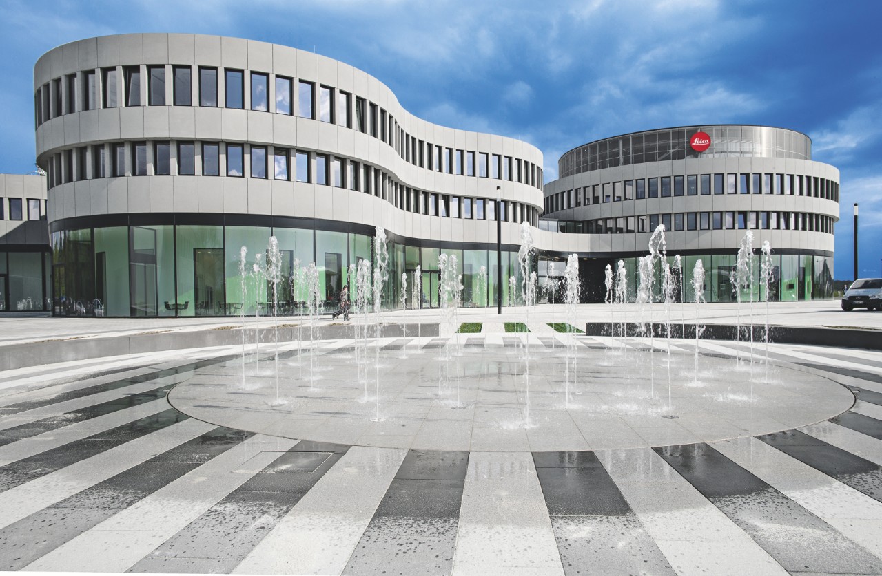 Криволінійний фасад головного офісу нагадує набір об’єктивів для фотокамер. Дві циліндричні конструкції утворюють головний вхід до будівлі – кругові сегменти продовжуються всередині, забезпечуючи автоматичне поєднання з лінзами та кільцевими виробами Leica.
