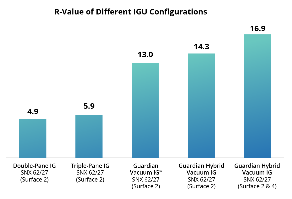 Thermal performance of Guardian Hybrid Vacuum IG products compared to other glazing options for Guardian SunGuard™ SNX 62/27 low-E coating  (glass thickness for all options is 4mm. Double pane, triple pane and hybrid options include a 12.7mm spacer with Argon):