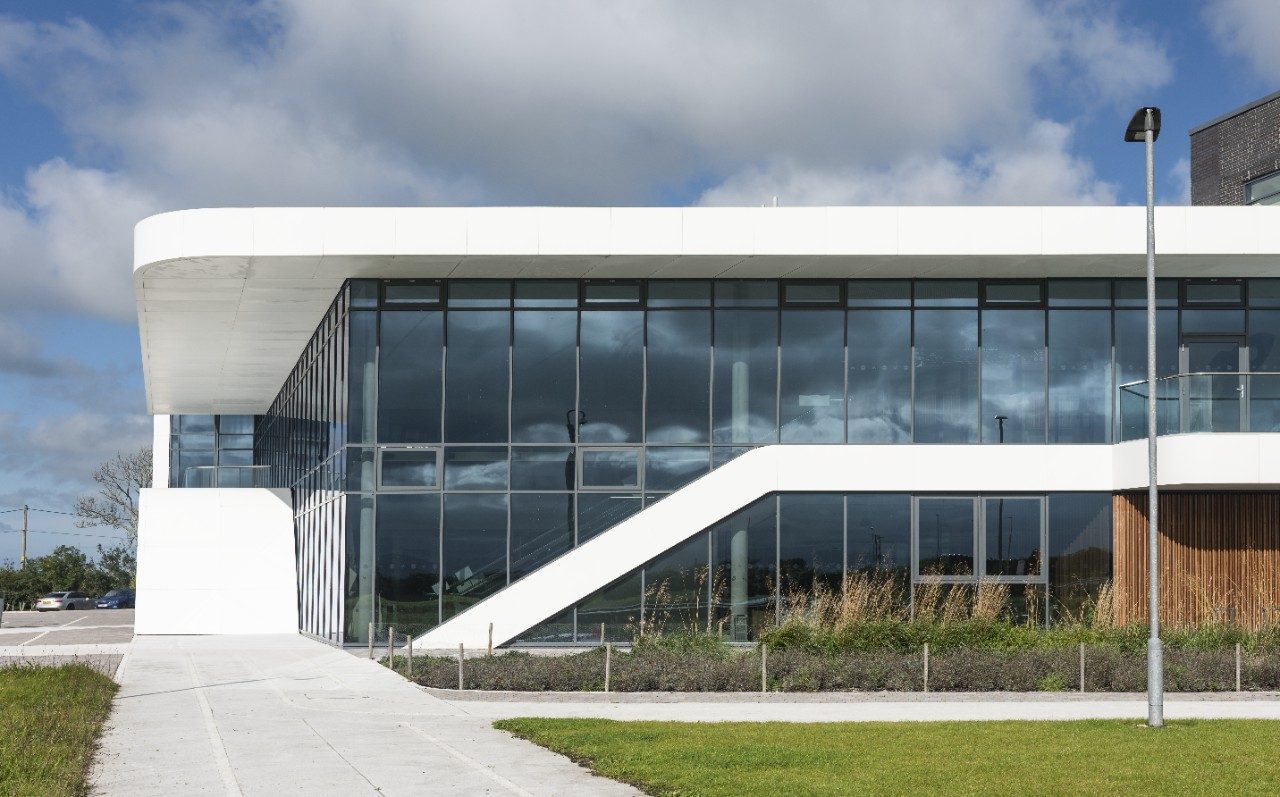 Designed by FaulknerBrowns Architects, the Menai Science Park (M-SParc) building in Anglesey, Wales, is a three-storey, 5000-square-meter workspace that consists of offices, laboratory, and workshop space for up to 700 people. The building has a visually striking, white continuous flowing ribbon that forms floor, wall and roof surfaces and wraps around the reflective glazed façade to the front elevation. One of the main priorities for the façade was to ensure transparency and openness, allowing occupants to enjoy the views of the surrounding area. Another key driver was low energy use, with the façade contributing significantly to the BREEAM Excellent standards of the building. Guardian SunGuard® SuperNeutral (SN) 29/18 coated solar control glass was chosen for the glazed parts of the façade. With its two layers of silver, SN 29/18 combines thermal insulation with a very high solar protection, helping to save energy consumption by reducing the need for cooling in hot seasons and heating in cold seasons.