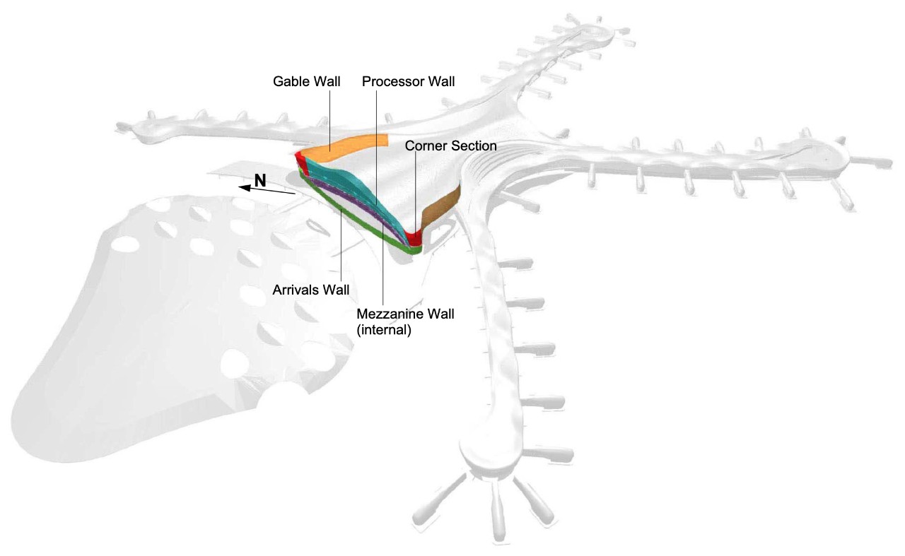 Descripción general de los componentes de la fachada delantera entre los dos de los brazos del muelle. (Crédito: Arup)