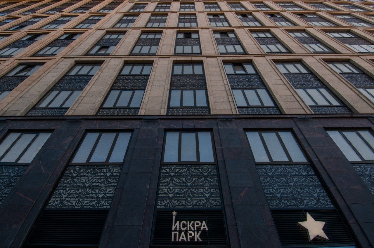 Os autores do projeto são a empresa Gals-Development e a agência de arquitetura SPEECH. Não é por acaso que eles são chamados de «pioneiros do retorno do Art Déco soviético». As construções dentro do complexo Iskra-Park distinguem-se pela geometria rígida de formas e tons nobres de pedras de acabamento, reminiscentes de uma era antiga. O design interior do lobby, com pé-direito alto e enormes janelas de vitrais, lembra a grandiosa entrada do Ukraina Hotel. O design original das fachadas do Iskra-Park incita ainda mais as associações, pois elas são decoradas com ornamentos, compostos por estrelas e aviões de cinco pontas. Lá dentro, você se dilui no ar da paisagem aristocrática criada por alamedas, canteiros de flores, gramados acabados e pavilhões.