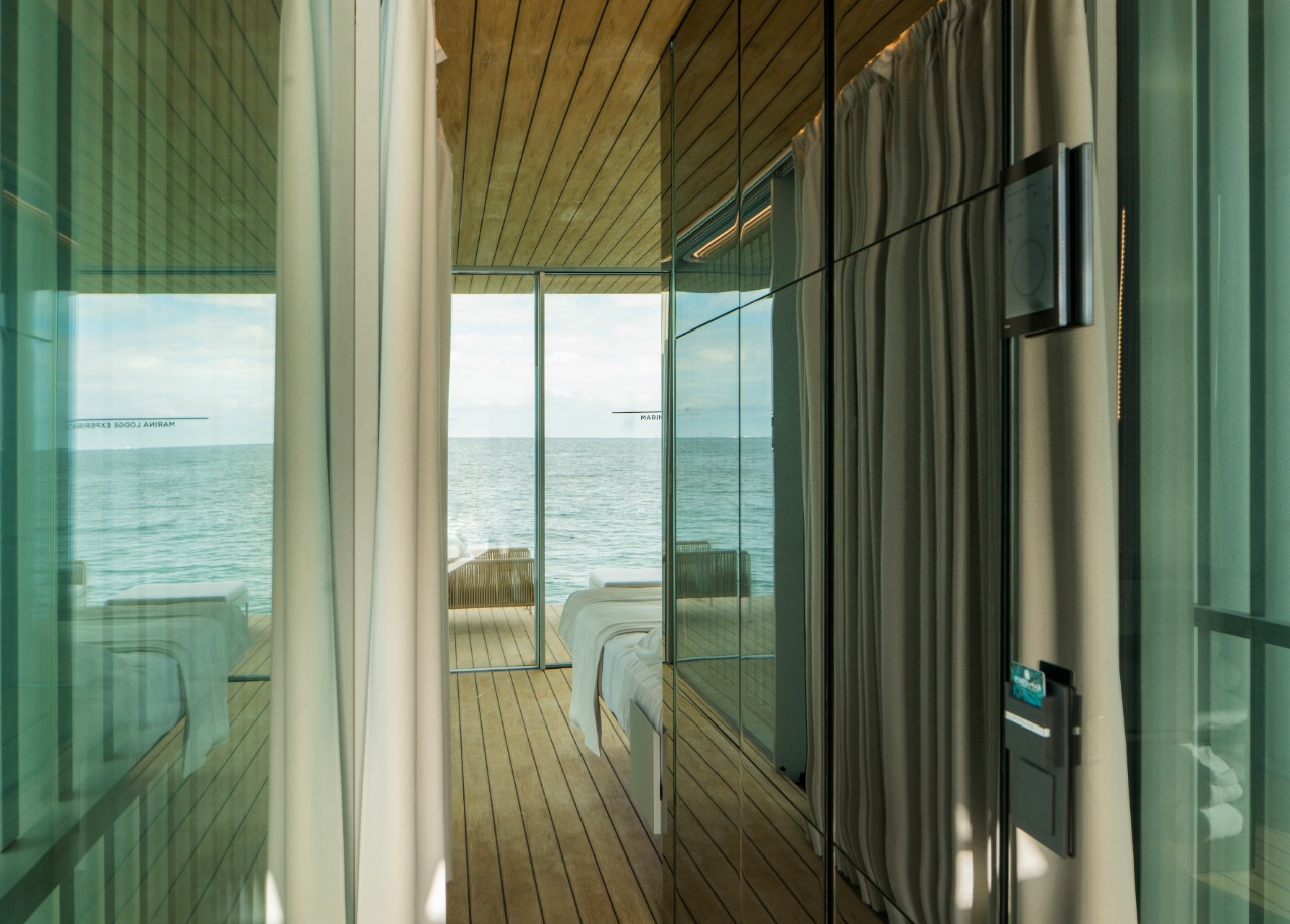 O arquiteto destaca: “A importância do vidro, bem como de todos os outros materiais que escolhemos, foi essencial. Por meio deles, procuramos proporcionar uma conexão total com os arredores. Em particular, o vidro deve ter algum desempenho específico em termos de transparência para alcançar isso (além do isolamento), bem como grandes dimensões para também resolver o aspecto de conforto. Isso soma-se ao fato de que o vidro usado para o espaço de convivência do alojamento permite uma experiência de 360 graus. O hóspede se sente envolvido pelo ambiente. Trata-se de uma experiência de integração total e o vidro ajuda a alcançar isso.”