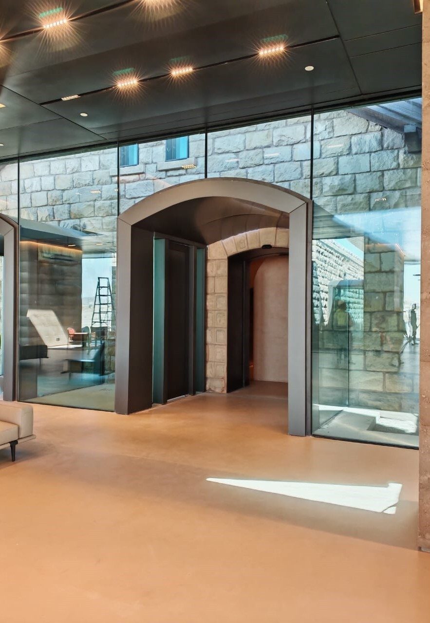 Original structural and exterior walls, some constructed from mud brick, have been meticulously preserved and incorporated into the hotel’s contemporary architecture.