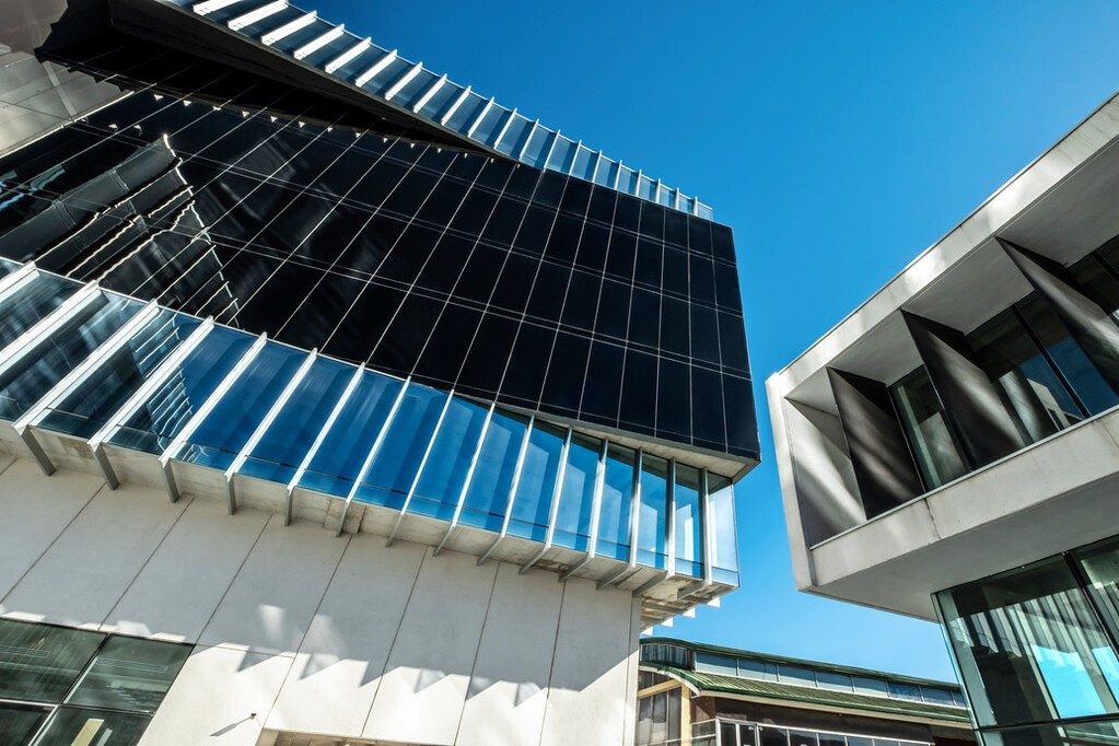 El vidrio permite vistas espectaculares y sin obstrucciones de las montañas y el paisaje circundantes. El diseño del edificio combina creatividad con originalidad, funcionalidad y eficiencia, así como instalaciones de vanguardia que crean un entorno de innovación que es ideal para las redes.