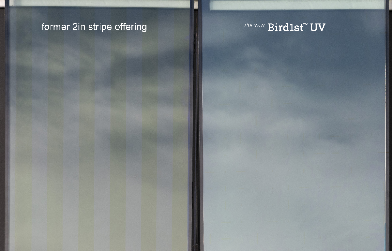 The new Bird1st™ UV can help you meet building requirements, while protecting clean, unobstructed views. With jumbo sheet sizes and non-directional patterning, it can help lower installed costs (vs. our first-generation product) by allowing fabricators to greatly increase yields from each stock sheet. And, while many alternative UV deterrents reflect about 30% of UV light, our Bird1st UV pattern reflects upwards of 75%, creating a signal to birds with an as-strong-as-possible chance of being seen. Boosting the contrast further, we require use of laminated outboard glass to absorb >99% of UV light outside the pattern. The result? A glass that provides a deterrent with our lowest level of visibility to humans, while earning a Threat Factor score of ≤25 from the American Bird Conservancy. Bird1st UV—a bird-friendly solution for designing beautifully unified façades.