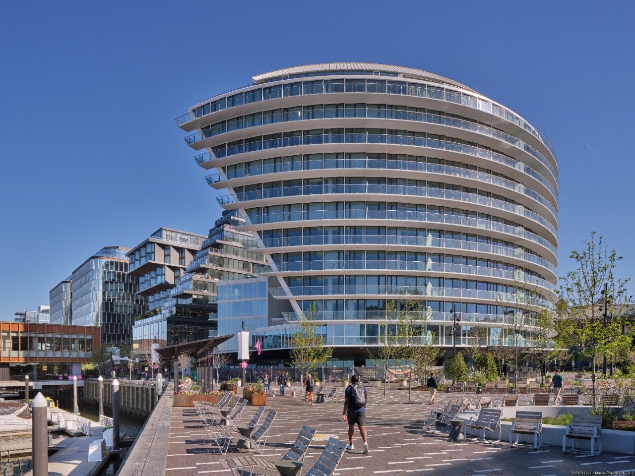 The dramatic, sweeping form of Amaris at The Wharf maximizes views, bathes each residence in daylight and creates a recognizable landmark along the Potomac River.
