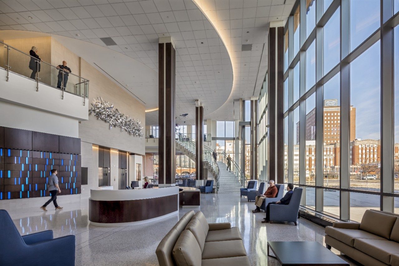 The pavilion of the Henry Ford Cancer Institute, with its soaring glass beacon, elevated ceilings and spacious windows, is awash in light. It signals and supports the comfort, hope and insight people find in this place. The institute is a destination for seamlessly integrated cancer care, not only for the 10,000+ new patients it serves each year, but also for medical professionals who come from afar to learn about emerging treatments, research and specialty clinics. Applied here on clear glass, SunGuard® SN 68 is a performance coating that transmits an extraordinary amount of light with an appealing neutral appearance, while minimizing the heat gained from the sun’s rays. In bathing this space with restorative daylight, it is part of a response to input from patients, survivors and their families, who envisioned the facility as a holistic healing environment.