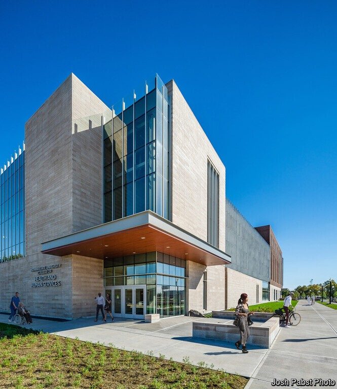 The new College of Health and Human Services Building at Indiana State University connects knowledge and people around some very important priorities. Its social work; applied health sciences; applied medicine and rehabilitation; and Kinesiology, recreation and sport departments converge here to collaborate. Their shared projects include teaching, research and outreach to the campus community as well as residents of the surrounding Wabash Valley neighborhood.